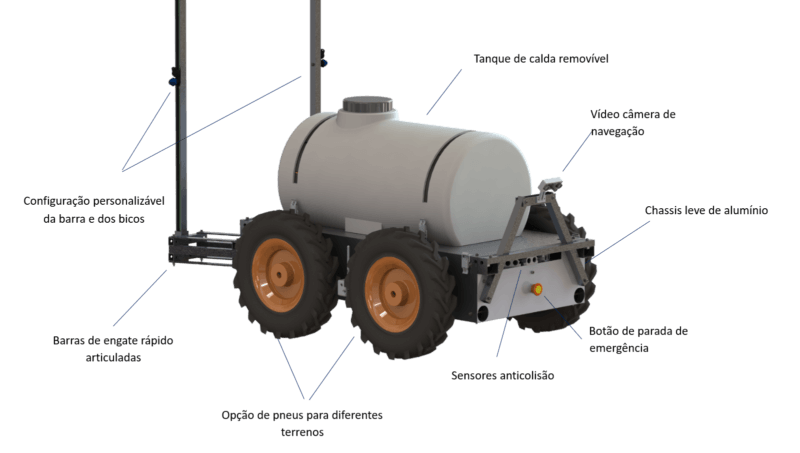 O AGR 125 faz a pulverização com precisão e alta cobertura, sem deriva e escorrega. Além de regular suas bombas elétricas, o robô ajusta a distância de suas barras às plantas e elimina a sobreposição dos jatos. Ele mais que duplica a velocidade de aplicação ao pulverizar ambos os lados ao mesmo tempo.